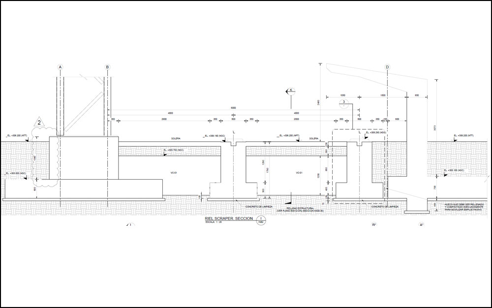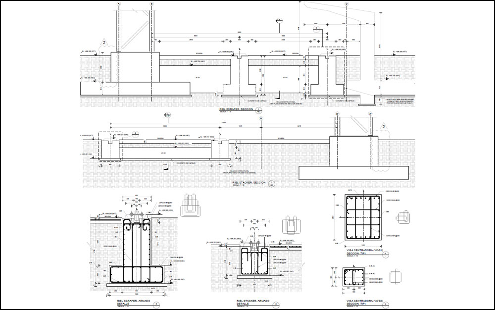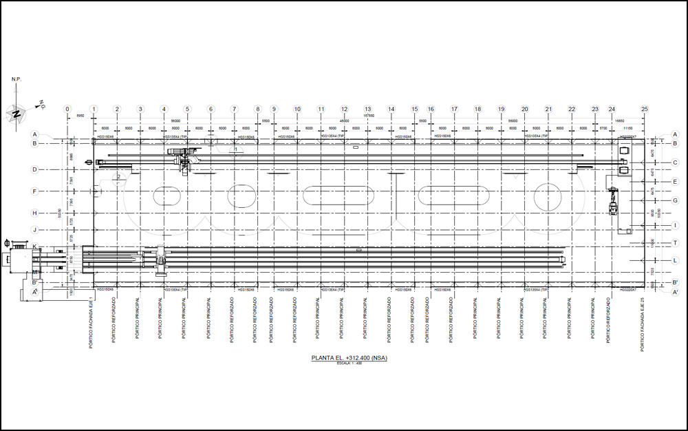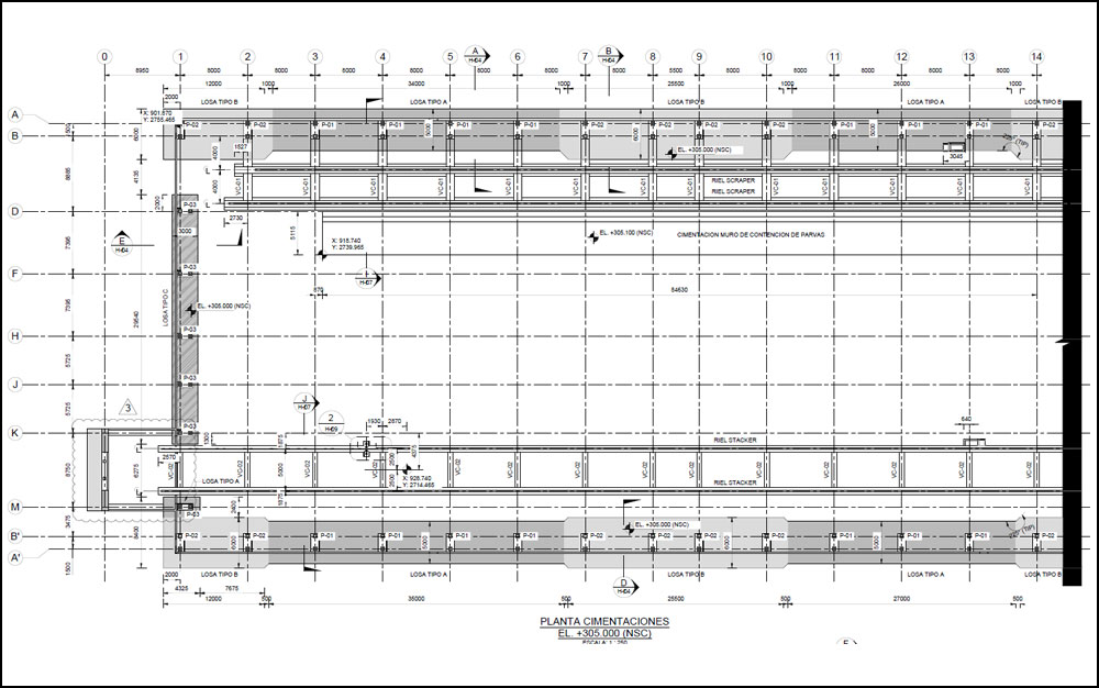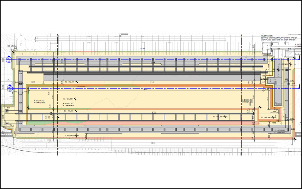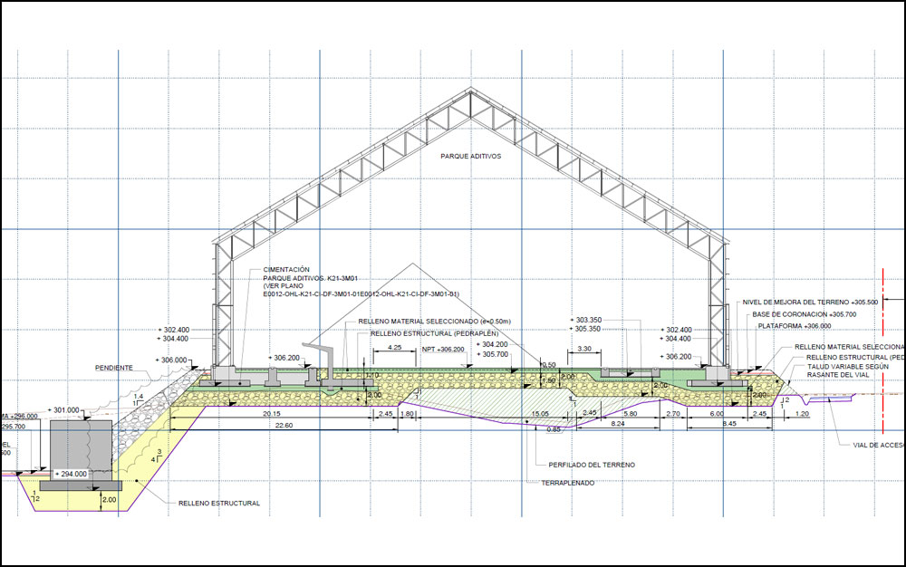 The building is founded on an embankment carefully designed to avoid the differential settlements from the massive portal stacker reclaimer moving inside the building.